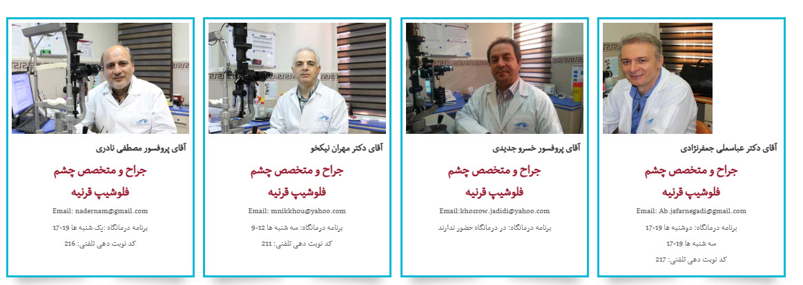- فلوشیپ قرنیه: پروفسور مصطفی نادری، دکتر مهران نیکخو، پروفسور خسرو جدیدی، دکتر عباسعلی جعفرنژادی، دکتر شیلا آرامش، دکتر حمیدرضا ذبیحی یگانه، دکتر سید حسام هاشمیان.