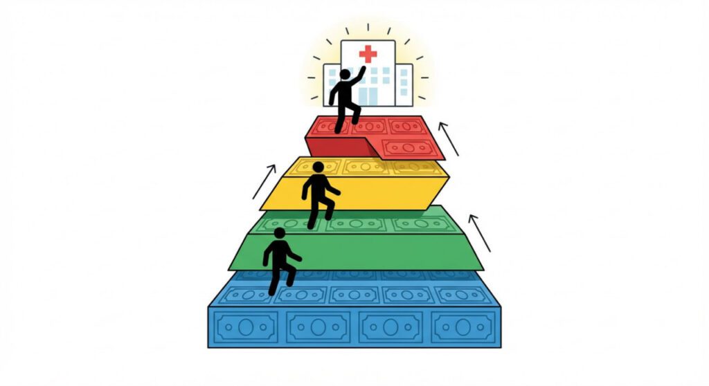 - حق بیمه ماهانه (Premium): مبلغ ثابتی است که فرد (یا کارفرما) هر ماه بابت داشتن بیمه سلامت میپردازد[33]. این هزینه صرفنظر از اینکه فرد در آن ماه از خدمات پزشکی استفاده بکند یا نه باید پرداخت شود. حق بیمه بسته به طرح انتخابی، میزان پوشش، سن فرد، منطقه زندگی و تعداد افراد تحت پوشش میتواند متغیر باشد[34]. در بیمههای گروهی کارفرمایی معمولاً کارفرما بخش عمده Premium را میدهد و کارمند مثلاً ۱۰-۳۰٪ آن را از حقوق میپردازد. در بیمههای انفرادی، اگر فرد واجد شرایط یارانه دولتی باشد، بخشی از حق بیمهاش توسط دولت پرداخت میشود. حق بیمه طرحهای ارزان (مثل برنزی) کمتر است اما در زمان دریافت خدمات هزینه بیشتری بر عهده فرد خواهد بود[35].